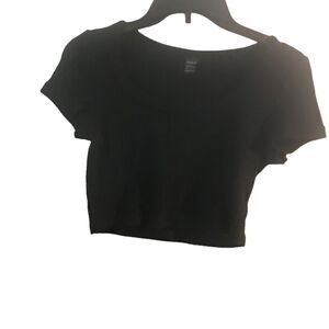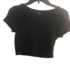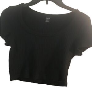 Shein Size medium women’s black crop top short sleeves 4% elastin 62% polyester 24% viscose excellent condition no issues P 187 B 158