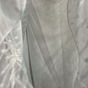 White long-sleeved Swiss dot ruffle hem dress. Open back, with a tie at the upper back and side zipper. 25" length and PTP 16". Preloved.