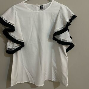 Shein white ruffle sleeve loose blouse with black detailing.