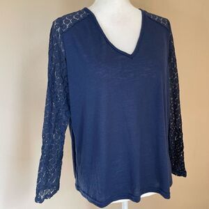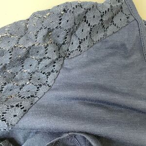 Navy blue, lightweight, breathable with open crotchet knit floral sleeves. Is soft and Has stretch.