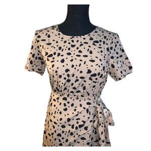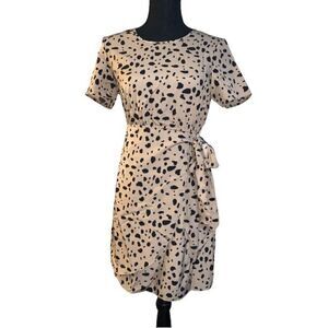 Tan and black allover print mini dress. Short sleeve. Round neckline. Front wrap. Elastic waistline. Keyhole back with button closure. 100% polyester. Size: XS (2). NWOT.