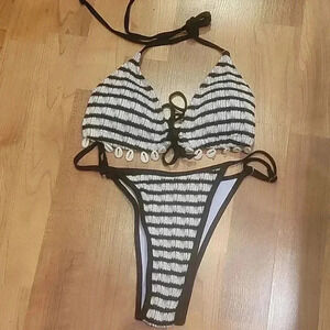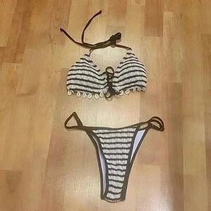 Shein Swimsuit 2-PC String Bikini Top + Bottom Stripes Print Cowrie Shells …