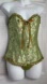 Corset top and bottom are trimmed in a green ribbon with a gold ribbon in the center to create an ultra feminine look.