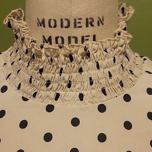Seeing blouse Size small Cream with black polka dots Ruched collar Cute with black suit