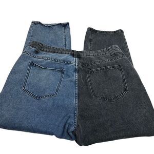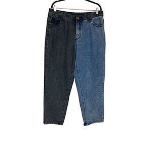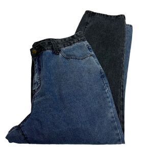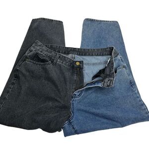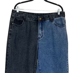 Shein Curve spliced half black half blue jeans size 1XL. Good used condition. 85% cotton 15% viscose. Waist 17” Rise 13” Inseam 28”. Good condition.