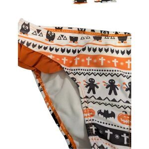 Shekini girls 2 piece swimsuit with Halloween voodoo theme. Halter top with ruffles on the bottom.