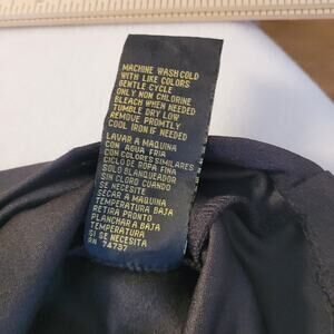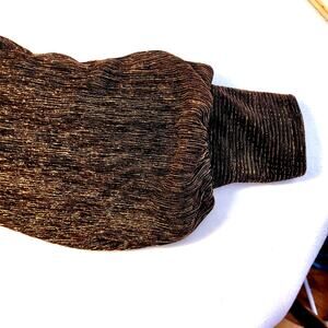 Puffy sleeves, liner under metaliic top and sleeves, elastic at waist, back zipper and eye hook, no splits on skirt. A few minor loose threads looks lightly worn at worst.