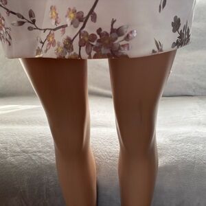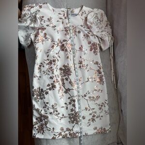 Gorgeous sheath dress from Shelby & Palmer with metallic floral print and ruched sleeves. Perfect for any occasion. This sophisticated cream sheath dress by Shelby & Palmer is designed with a cold shoulder neckline and flutter sleeves, making it ideal for a wedding guest or cocktail event. The dress features an elegant floral print with pink cherry blossoms, adding a touch of femininity to its chic design.