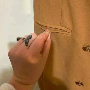 On the back down low there is small stains please check pictures. Far buttons are for look clear button on the inside of the coat are used for closure and outer outside buttons have a slight pulled thread and are also used to button the coat up.Beautiful coat for business or everyday look.