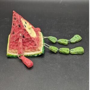 Shelf Sitter, Fruit, Watermelon, Anthropomorphic kitschy Face, Resin, Figurine, Red/pink, from the 1980's. No chips or cracks that I see. There is marker on the bottom, see photos. There is an unpainted/small chipped spot on the green base on it's back and not visible from the front, see photos. Grandma, Cottage, Kitschy styles.