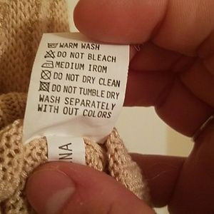 Cream colored with gold pattern. Small pocket off left, front side. Size small/medium. Machine wash for care.