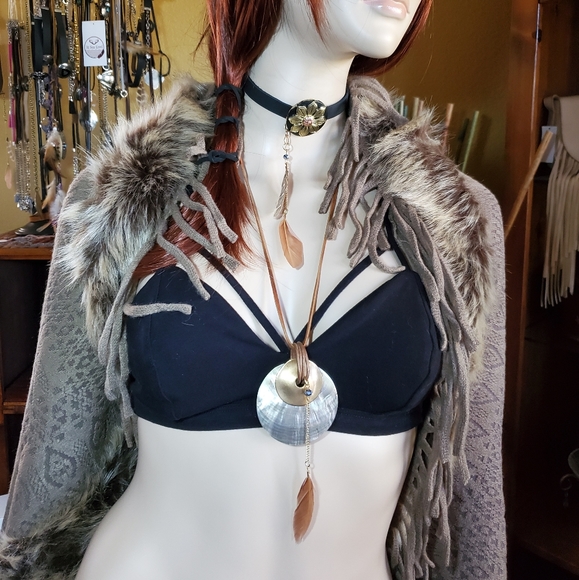 One of a kind real shell necklace on a long leather strip with hanging feathers. This amazing piece can be worn any length. Bohemian, gypsy, beach vibe. Great to layer with a choker and other pieces.