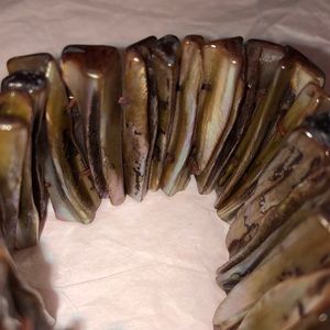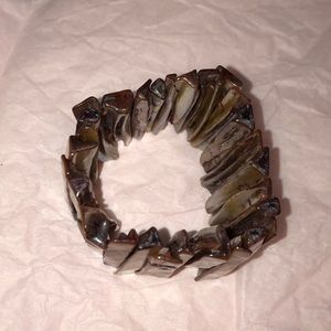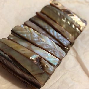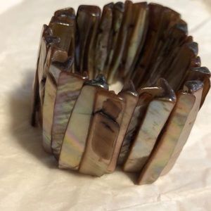 Bangle Bracelet made from pieces of shell with a slight pink tone. Colors range on this piece. Worn a few times but in great condition!