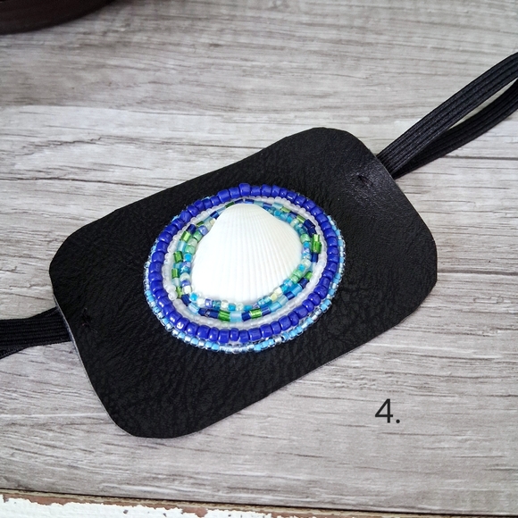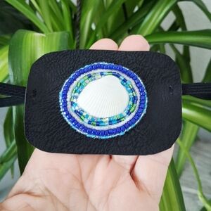 Hand beaded seashell statement eye patch Adjustable custom high profile vision accessory One size fits most Costume accessories, vision accessory, eye fashion Patch measures about 3.5" 1 piece Right or left eye Hand beaded & stitched