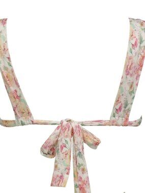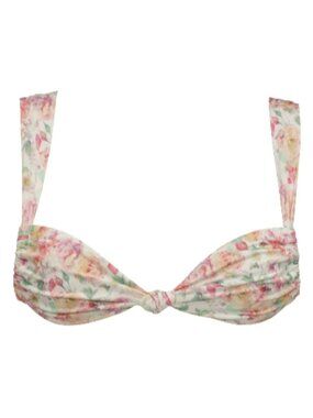 The bikini top is ruched and twisted in the middle with a tied knot in a way that emphasizes the colorful details of the set. The top has wide adjustable straps for a comfortable fit.