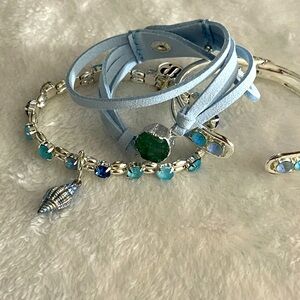 Stylish bracelet set featuring blue and silver tones. Includes a leather wrap bracelet and beaded accents.