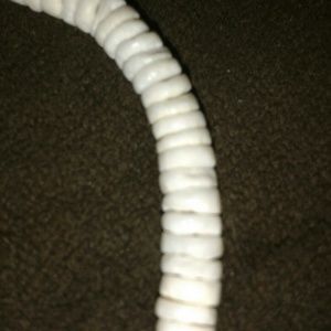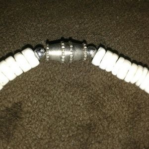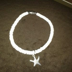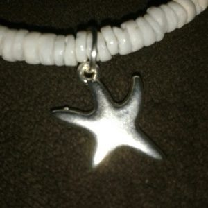 Handcrafted, shell beads, silver colored starfish charm, barrel clasp.