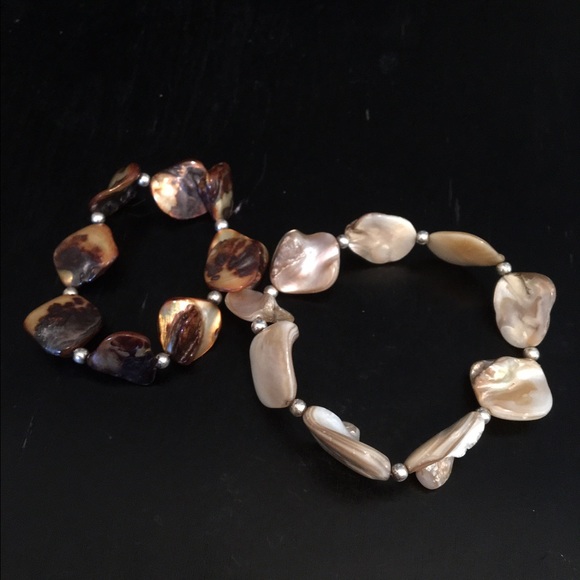 Beige and brown shell bracelets that would look super cute with a sundress. They run a little small but stretchy. Ask me about bundling! Also selling on ♏️