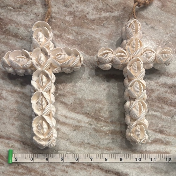 Beautiful Texas-coast shell crosses. Pick one or the pair. Beautiful, intricate, handmade shell design with natural rope hanger. Perfect for nautical, beach, tropical home decor. One (1) for $10, pair for $15.