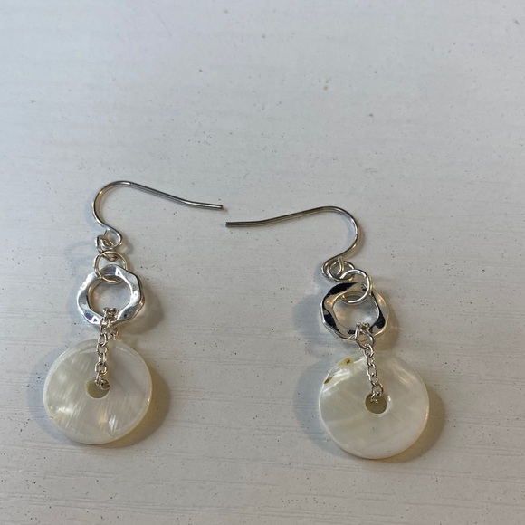 Elegant dangle earrings with silver hooks and cream circular pendants. Perfect for any occasion. P7
