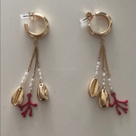 Shell and coral earrings, gold tone. Hang from hoop about 1.5 inch.