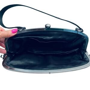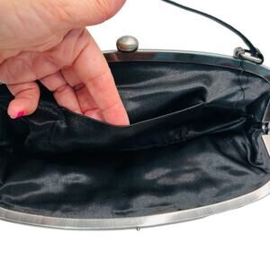 One side has silver/gray shell embellishment (like mother of pearl or abalone) the back side is solid satiny black