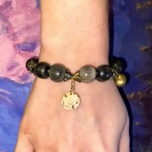 Bracelet made with nuts beads and a frog charm made from shells. The charm was cleaned and sourced from another piece of jewelry. This piece is brand new and there’s only one of these bracelets in my shop.
