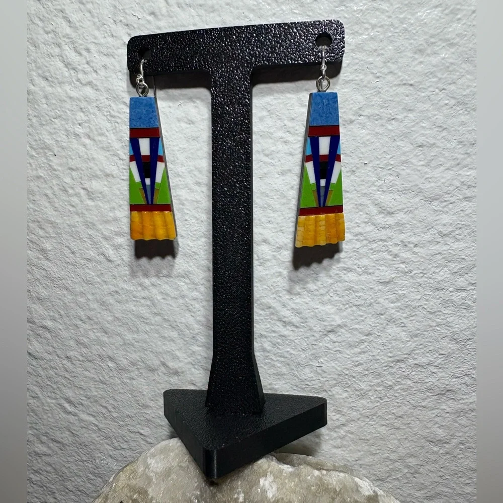Multi-Stone Earrings Inlaid with Turquoise, Spiny, Red Coral, Black Onyx with a Black Matrix.