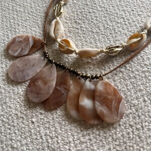 Beautiful layered statement necklace featuring faux shell-style beads and translucent teardrop charms in warm neutral tones. The design combines a beachy, boho vibe with a bold silhouette, making it perfect for summer outfits, vacations, or adding texture to a simple look.