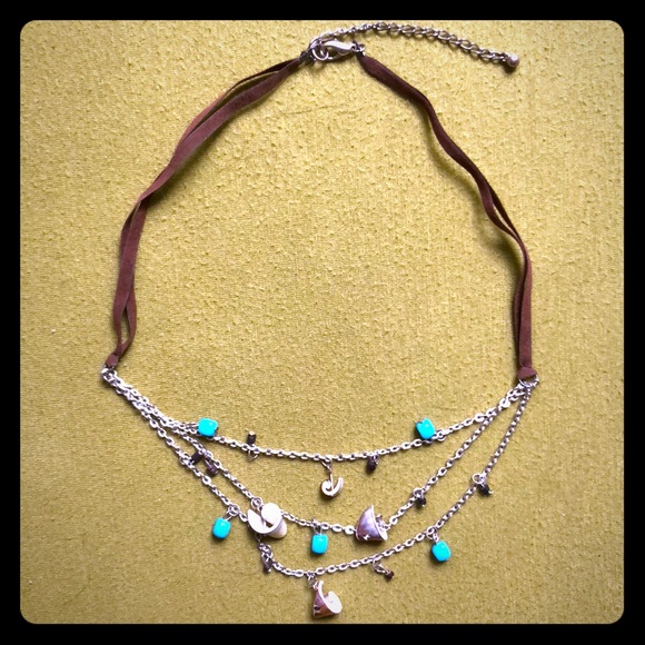 Layered look adjustable brown/ silver necklace with brown/ cream shells and turquoise accents. Make me an offer or hit the bundle button.