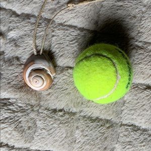 Collected from Santa Barbara, CA this shell necklace allows you to carry the beach with you wherever you go. Beautiful shell on adjustable twine. Tennis ball for size comparison.