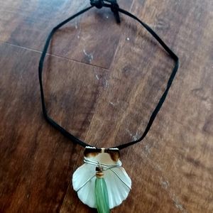 Handmade with a shell,leather, wooden beads and a delicate pearl.