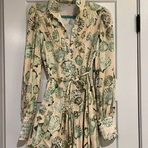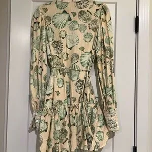 Chic button-up dress with a Shell pattern. Features a tie waist and long sleeves.