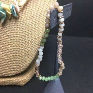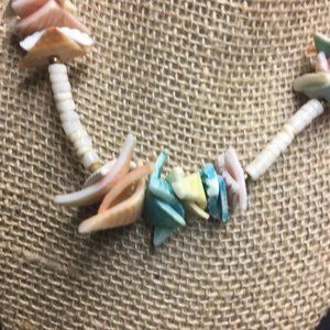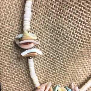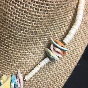 BoHo necklace with puka pooka shell beads in white, salmon, pink, light blue, pale yellow, goldtone spacer beads and screw closure! Coordinating colors stretch bracelet in faceted sparkly acrylic beads!