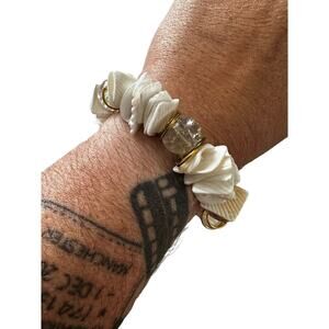 Pieces of sea shell cut into chips, gold hoops and big clear glass marbles make up this vintage stretch bracelet. This bracelet gives beachy, boho vibes, while keeping a neutral, easy to pair feel. The white and light cream shells, gold and clear make it simple, but the textures give it tons of detail. I have a 7" wrist and it is shown on me and it went on and off pretty easily.