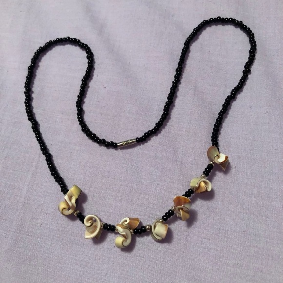 Made of black beads and pink/brownish shells. About 20” long. Handmade!