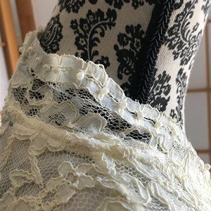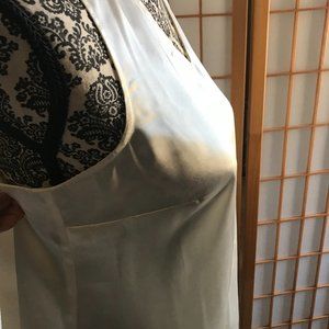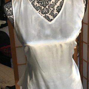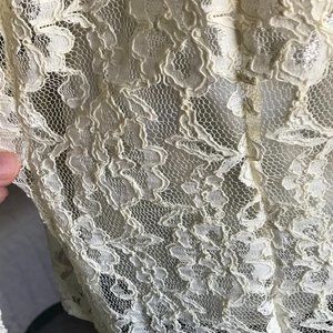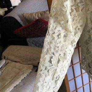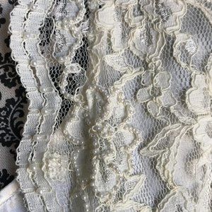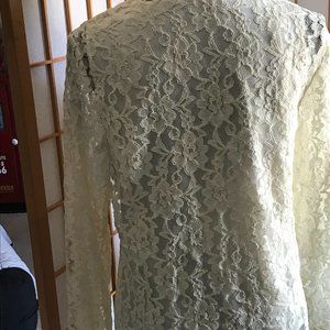 Ivory satin fitted shell with V neck; matching fitted ivory lace jacket; long sleeves; pearls around stand-up collar and down jacket front; no closure; size is estimated. Shell is 22" long; jacket 24" long; 22.5" pit to pit. Excellent condition; dry clean.
