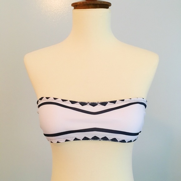 This bikini set comes with the white based bandeau top, with black shells on the edges. The bottoms that match it are black based with white shells on the edges. The bottoms have ties on the sides so they can adjust to how you want them to fit. (Never worn)