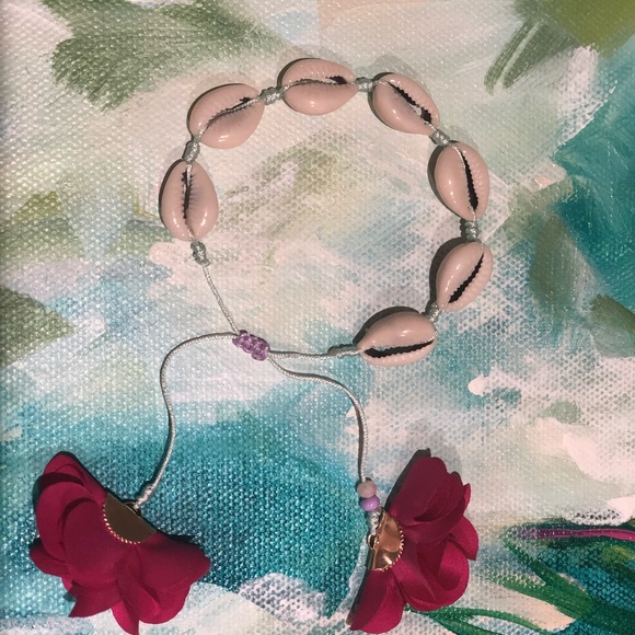 hand made by me. The flower is hot pink, lilac knot and light green strip