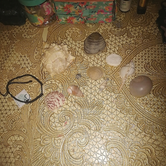 seashell collection including bracelet, and clamshell fossil.