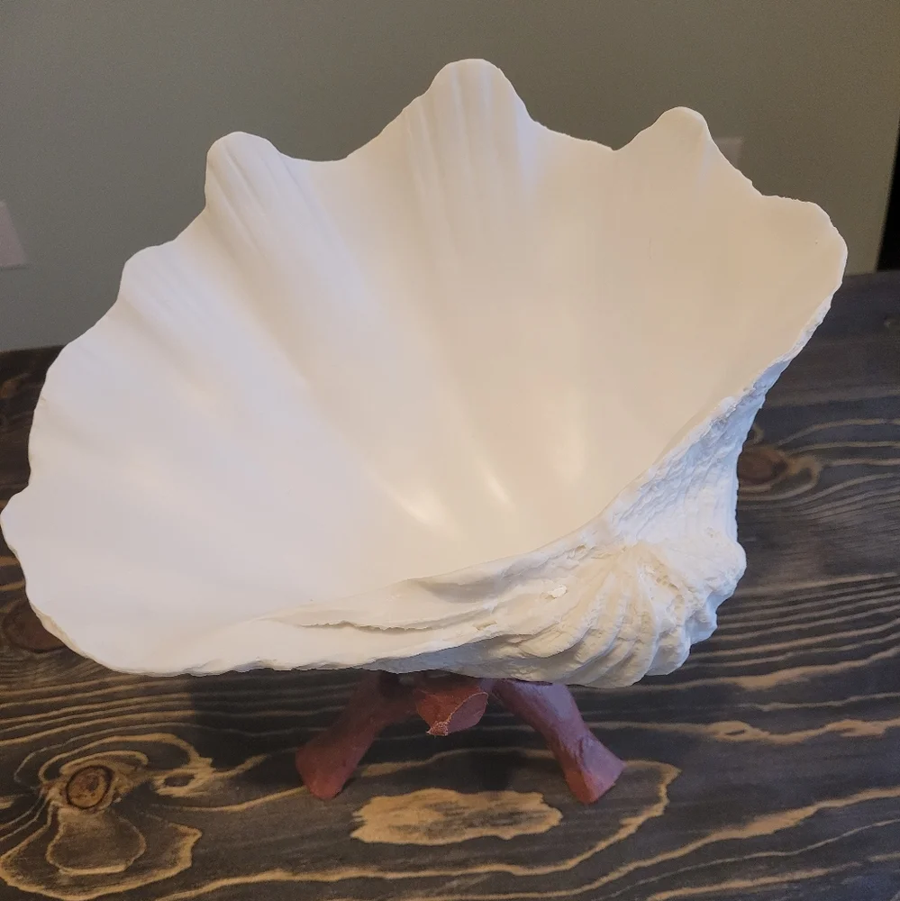 Large white shell with wood stand. 10 inches wide 8 inches tall. Can put smaller shells or other decor inside of the big shell. Great detail on the large shell.