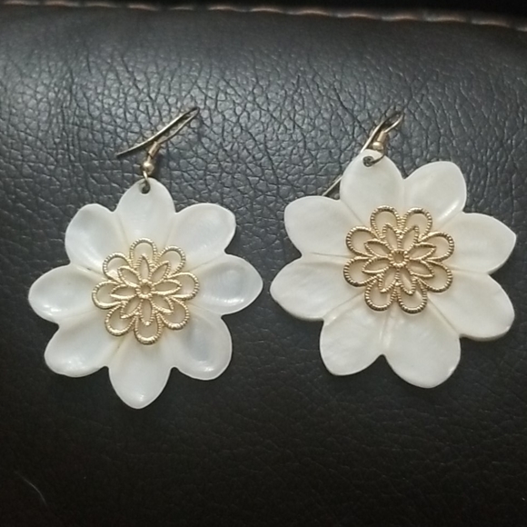 Flower shaped shell earing with gold flowers in the middle.