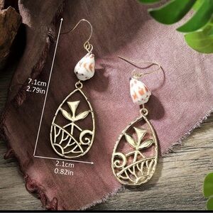 These elegant dangle earrings feature a beautiful combination of gold and white, perfect for adding a touch of sophistication to any outfit. The intricate design showcases exquisite craftsmanship. Measurements in pics, brand new.