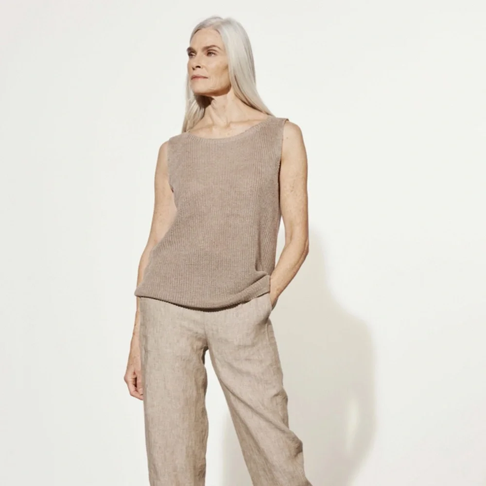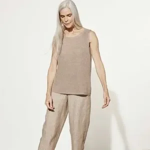 Simple lines and subtle texture define this bateau neck shell. In an organic linen knit with melanged color. Light gray. Free style. True to the size. You can wear alone or with white button down shirt. Very flattering. New with tags.