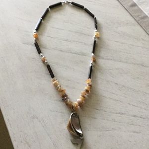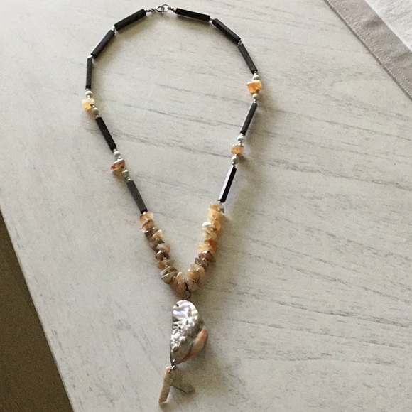 Shell necklace, 24”, mother of pearl shell pendant hanging from a ‘chain’ made up of plastic, beads and faux stones. Spring clasp is strong and works well.