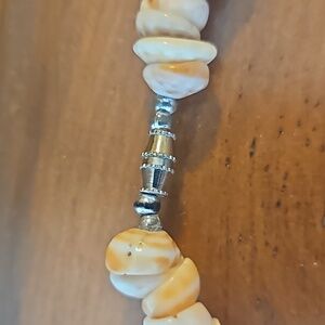 Shell necklace. Colors: browns and creams with some orange bits. 20 inches end to end.