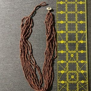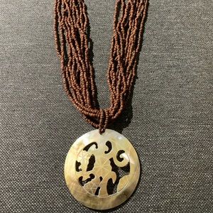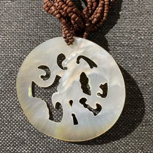 Beaded necklace with natural hand carved mother of pearl shell pendant. Button clasp.