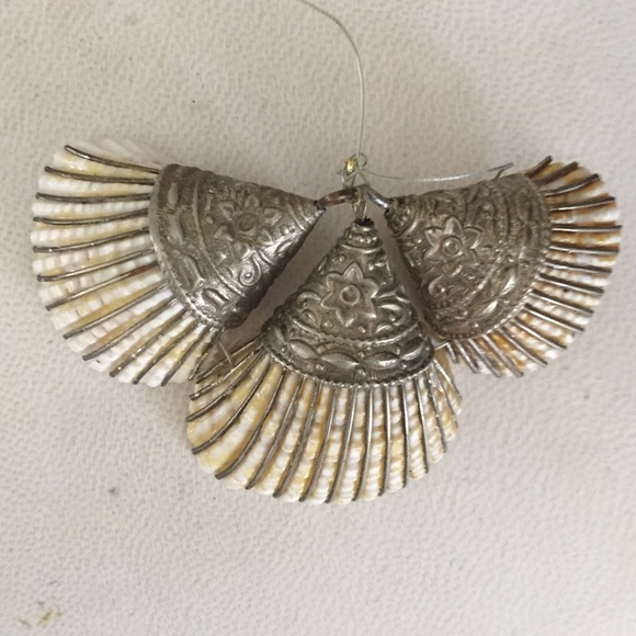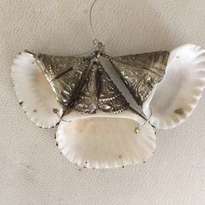 Three natural shells wired together and hand embellished with caps of pounded silver-tone metal in star flower pattern. Not sure if the metal is silver or not. Just right for the boho woman or the Pinterest crafter! Would be lovely to make into unique necklace, bracelet, crown or belt -- be creative!