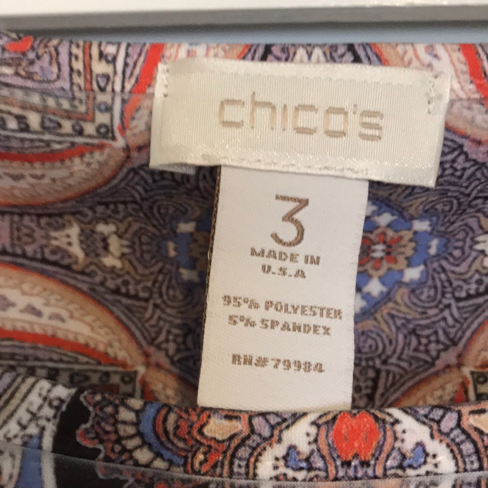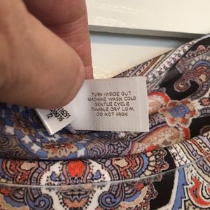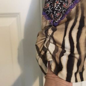 Animal print and paisley poly-span combo with sparkles on front, ruching at lower side seams; dressy alone or under jacket.
