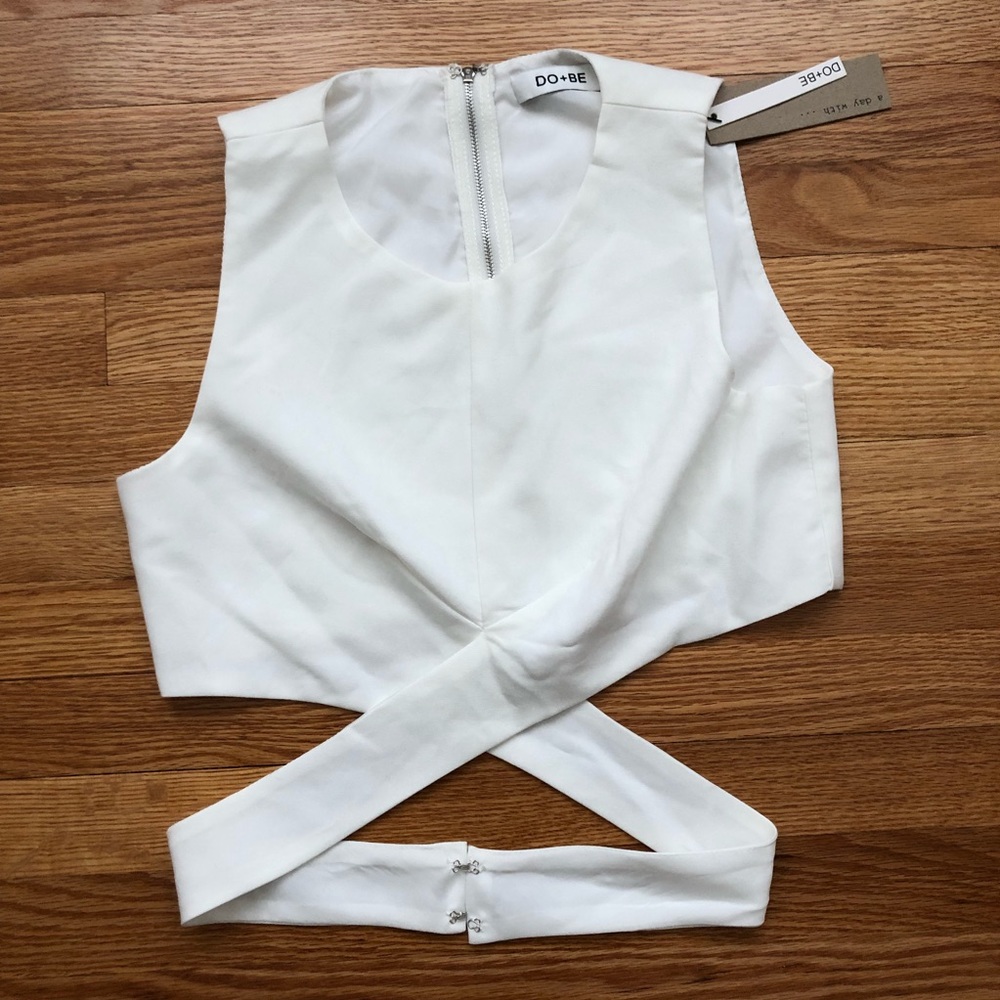 White shell top. Zips down back. With wrap that clips in back. BRAND NEW! Size large but fits more like a medium